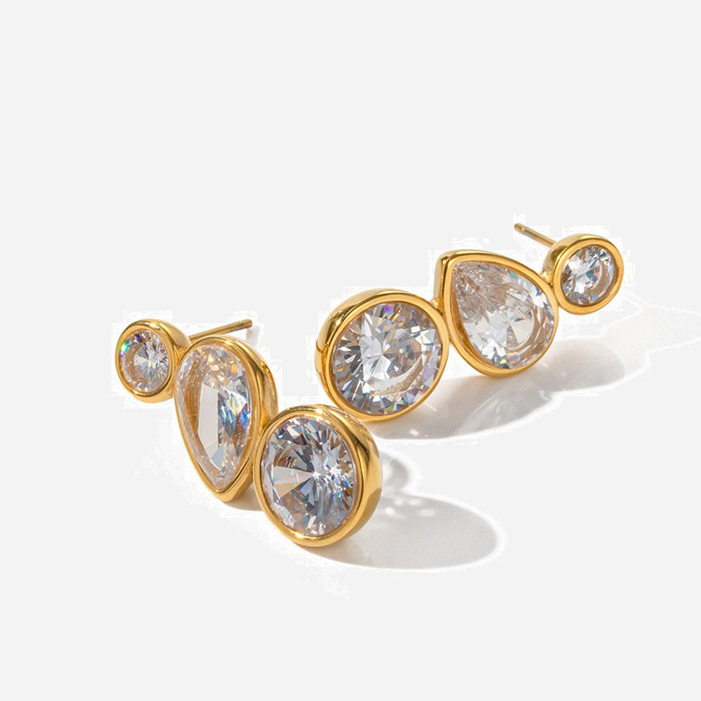 Elevate your style with Geometric Sparkles earrings, featuring three zircon stones expertly set in distinct geometric shapes. These earrings blend contemporary design with brilliant sparkle, offering a sophisticated statement piece that enhances both casual and formal looks. Crafted for those who appreciate precision and elegance in their accessories.