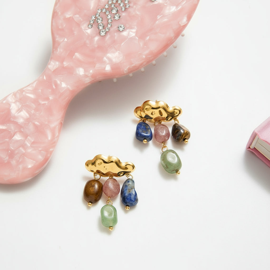 Inspired by “Raincouver”, this 18k gold earrings featuring natural stone drops in an array of colors, each meticulously shaped like raindrops cascading from cloud motifs. This design captures the serene beauty of rainy Vancouver, with natural gemstones in varying hues creating a subtle gradient effect. The precious metal setting ensures durability and timeless elegance, while the thoughtful composition evokes both nature's tranquility and artistic sophistication. Perfect for those who appreciate refined jewelry that tells a poetic story.